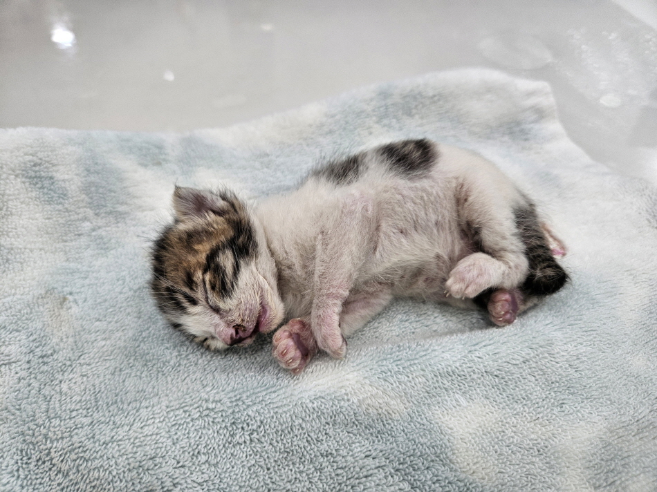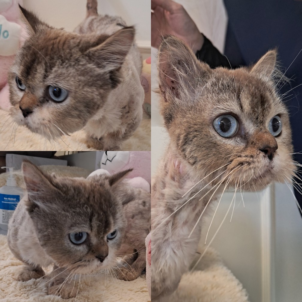 절에 들어가고 싶었는지 얼굴 대신 몸통 털을 민 고양이. 피부병 심함.