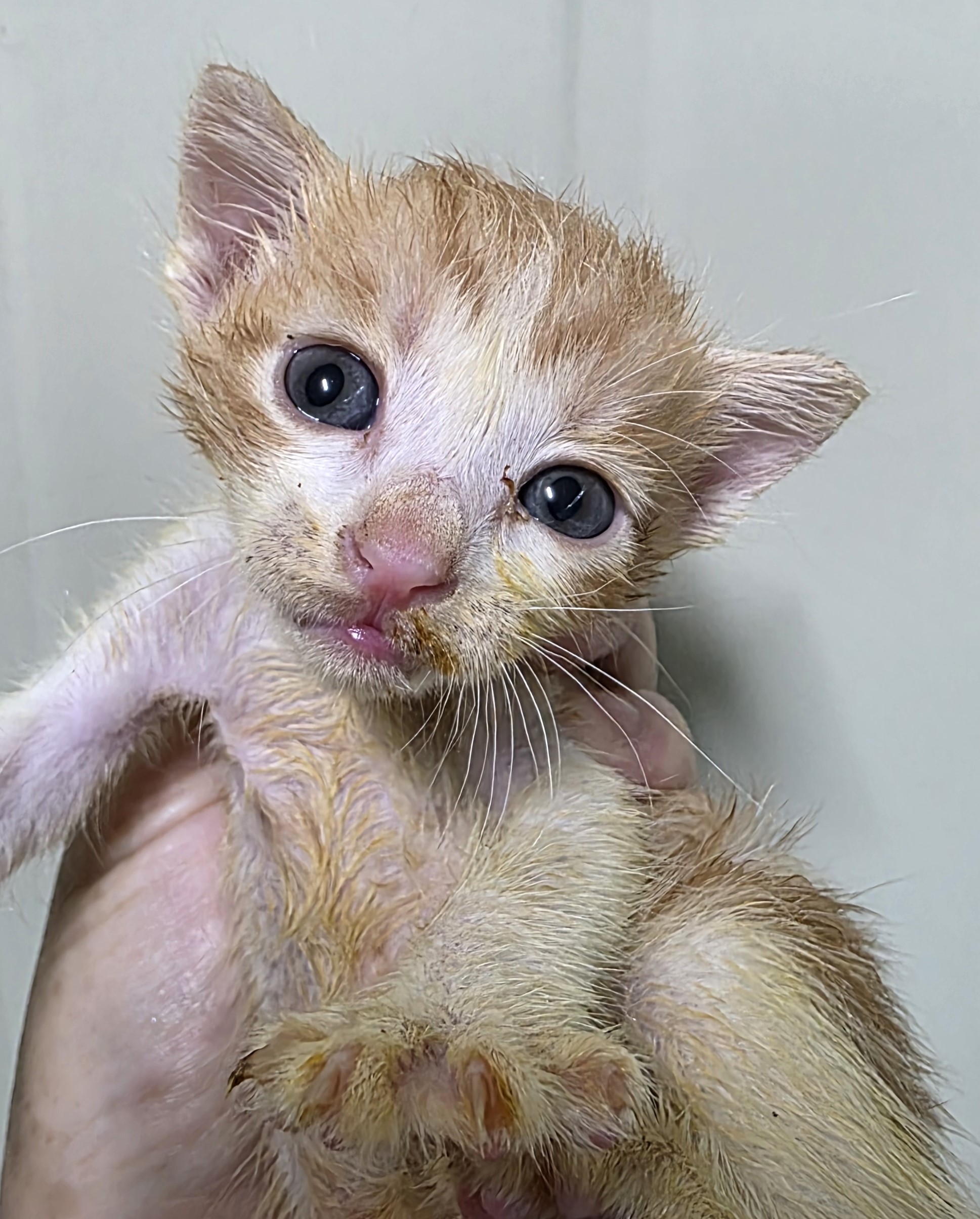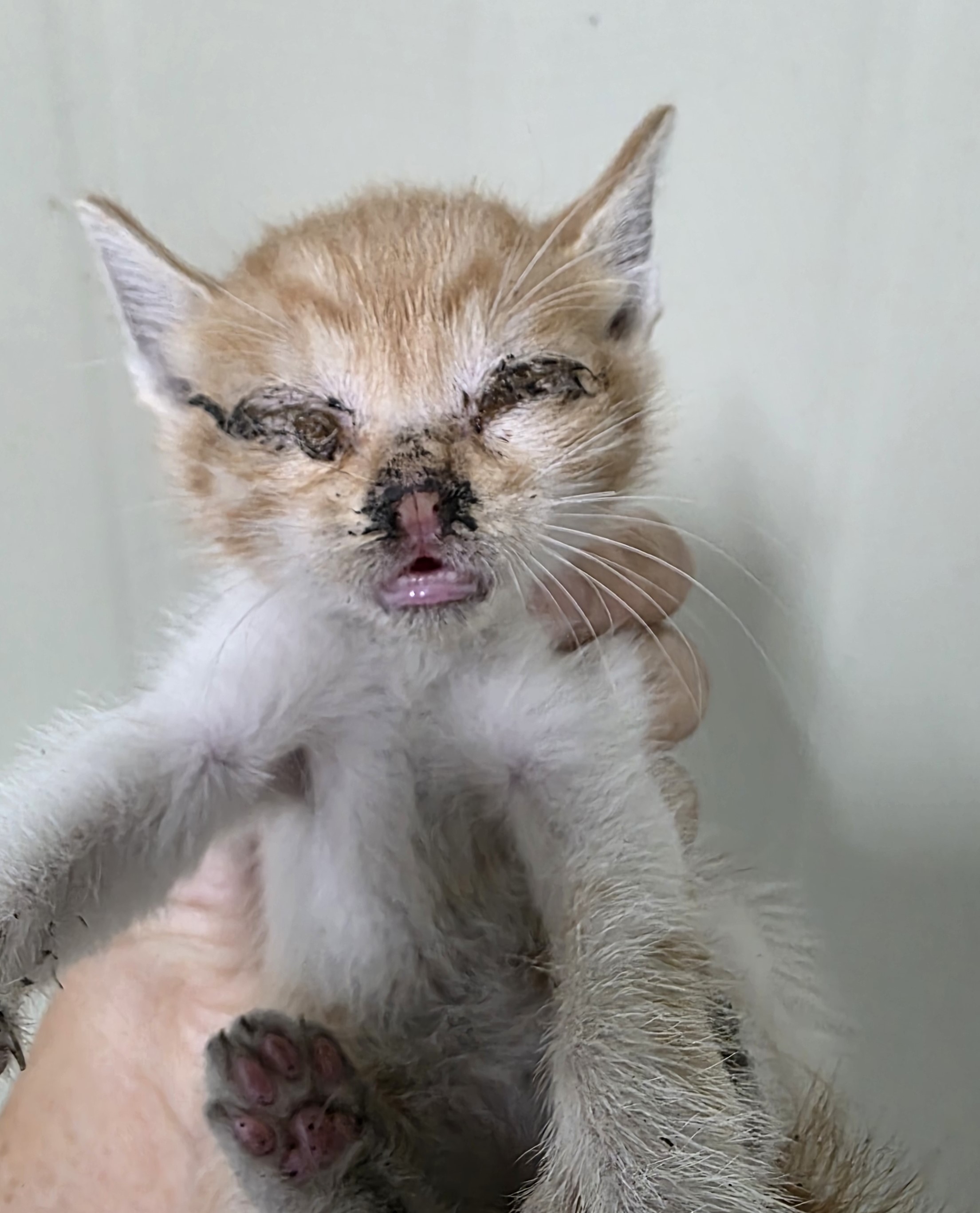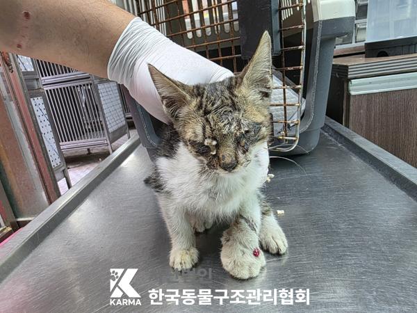 심한 눈곱으로 눈 못 뜸. 코 검정. 좌 전지 부종. 진물. 온순. 털 상태 양호.